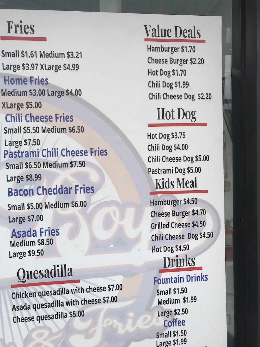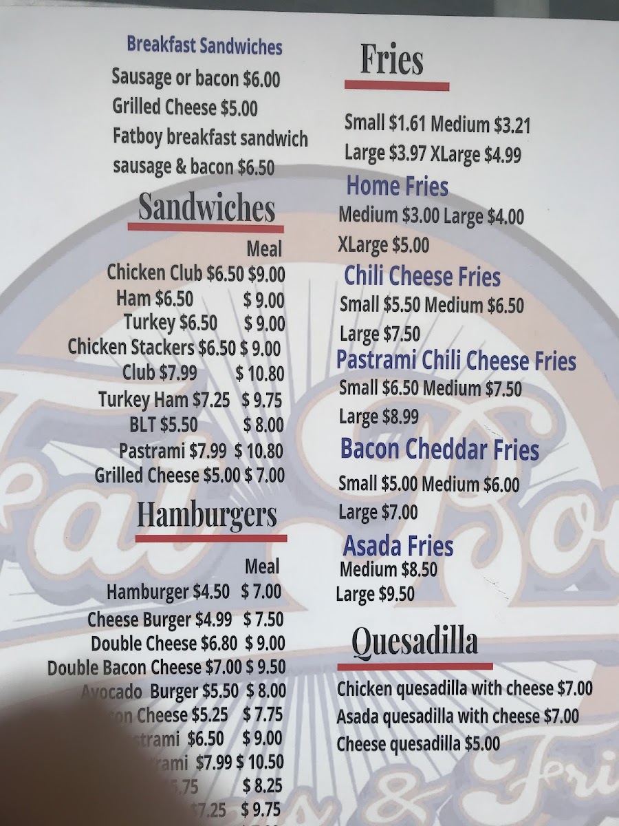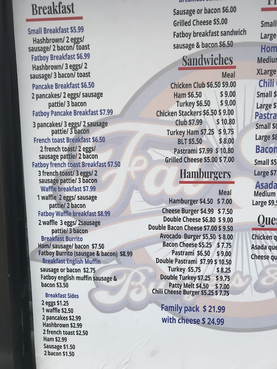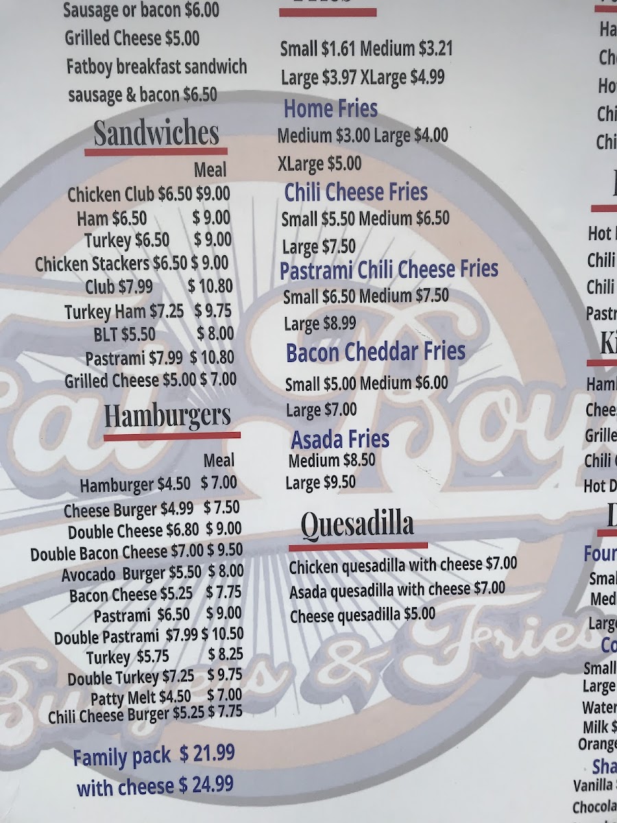 At Fat Boys Burgers & Fries Menu, you'll find a delicious variety of burgers, fries, and more, each crafted to satisfy any craving. Located at 7651 San Pedro St in Los Angeles, CA, this spot is all about big flavors and hearty portions. Whether you're in the mood for a classic burger, a specialty creation, or some crispy, golden fries, there's something here for everyone. The juicy patties are perfectly seasoned and cooked to order, and each burger is made with the freshest ingredients. Pair that with a side of perfectly fried fries, and you've got a meal that hits the spot every time. If you're looking for a casual, fun dining experience with great food, this is the place to be.
